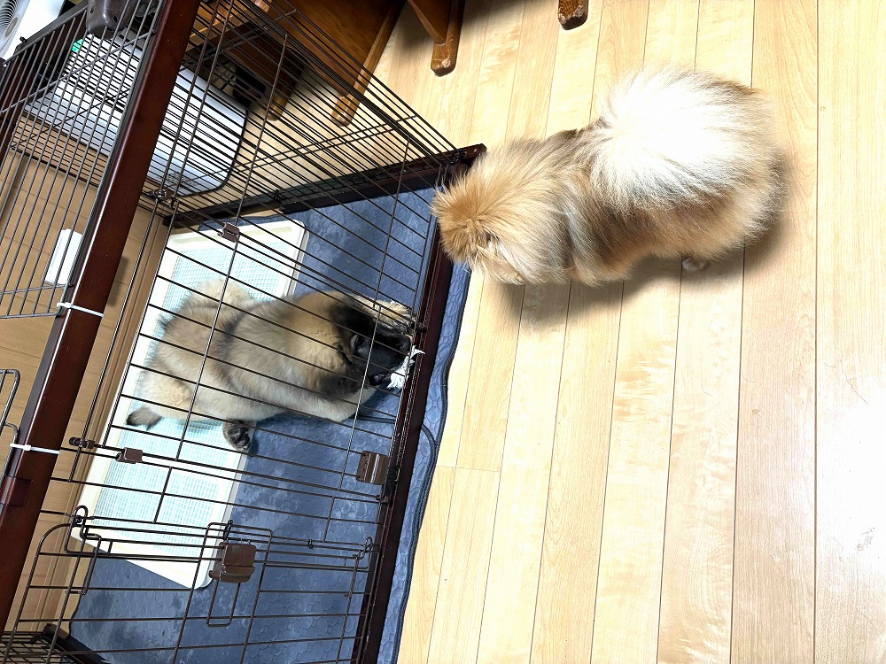 井上様 大は無事、家に着きました。 チャウとポメの大合唱で迎え入れてもらいました。 用意してたケージは屋根が無かったので乗り上げてしまい、急遽屋根を設置するなど慌しくしていましてご連絡が遅くなりました。 車酔いもなく、ウンチも形有るのをしました。物怖じしない仔ですね。 今後も成長を報告させていただきます。 この度は素敵なご縁をありがとうございました。 林内 林内さまへ ご連絡ありがとうござ